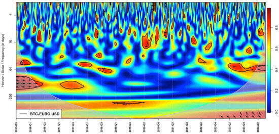 The WTC BTC–EURO/USD heatmap in Figure 3 reveals that BTC’s coherence with the euro is generally sporadic and lower in magnitude across various time–frequency bands. In many intervals, the phase arrows do not consistently display the strong out-of-phase (negative) relationship—indicated by arrows pointing predominantly left—that would be expected if BTC behaved like traditional USD-priced assets. Instead, there are regions where the phase relationship is ambiguous or even in-phase, suggesting that BTC’s price dynamics are not tightly coupled with euro movements. This irregularity in both coherence strength and phase direction implies that BTC may not simply react to euro fluctuations in a predictable manner. Consequently, these findings support the research hypothesis that BTC exhibits resilience to the global reserve currency, as its behavior deviates from the conventional inverse reaction seen in other asset classes.
