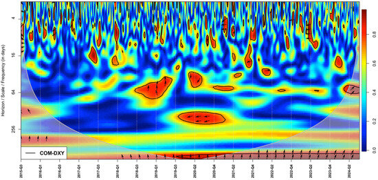 The null hypothesis posits that if BTC behaves like typical USD-priced assets, it will display substantial out-of-phase coherence with the DXY, while a resilient BTC will exhibit minimal or sporadic inverse coherence and a lower overall coherence magnitude. This hypothesis builds on the link revealed in the literature between BTC and the DXY (Baur et al., 2018; Mokni & Ajmi, 2021; Zitis et al., 2023), with more details on the characterization of such a relationship. To test this hypothesis, the multi-method wavelet analysis framework employed in this study comprises several components. First a WPS heatmap of the DXY is generated using the Morlet wavelet with an upper scaling factor of 6, following Smolo et al. (2024), which decomposes the DXY time series into its constituent time–frequency components. This process reveals both short-term shocks and longer-term cycles, setting the stage for subsequent comparisons. Next, the WTC between BTC and the DXY is computed, as well as between the DXY and various asset classes (including traded commodities such as the S&P GSCI, oil, and gold; global equities as the DJGI; and Ethereum). This bivariate analysis quantifies the strength and phase relationships of co-movements, allowing us to benchmark BTC’s dynamics against the typical inverse relationship expected under a strong-dollar scenario.