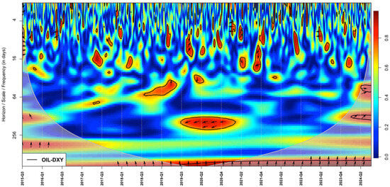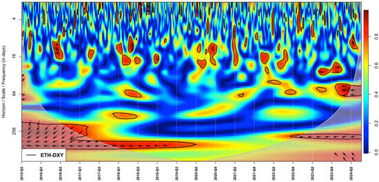 In all the WTC heatmaps, the expected pattern of a strong dollar leading (with leftward arrows denoting a negative correlation) is generally evident, especially for global equities and gold, which show a consistently higher inverse relationship with the DXY. Commodities and oil exhibit lower overall coherence, likely because the dollar’s movements are influenced by inflationary pressures that also drive commodity prices. Ethereum, meanwhile, reveals surprisingly subdued coherence values; however, this observation must be viewed in light of Ethereum’s substantial correlation and coherence with BTC (Al-Mansouri et al., 2025) and its comparatively smaller market depth. Consequently, focusing on BTC’s price behavior may offer a clearer perspective on the reduced ETH–DXY coherence.