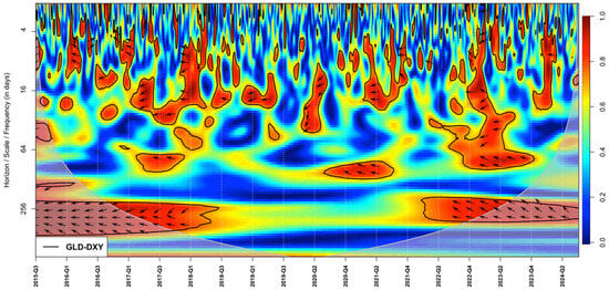 The findings of Noreng (2004), and Pukthuanthong and Roll (2011) provide a useful benchmark for interpreting the results. The WTC analysis indicates that most traditional USD-priced assets exhibit a strong negative correlation with the DXY, as evidenced by pronounced out-of-phase (negative) relationships in their heatmaps. For instance, gold consistently displays high negative coherence with the DXY, reflecting the typical “strong-dollar, weak-asset” behavior—suggesting that when the dollar strengthens, gold prices tend to fall, a response possibly driven by safe-haven dynamics and the scarcity of the US dollar.