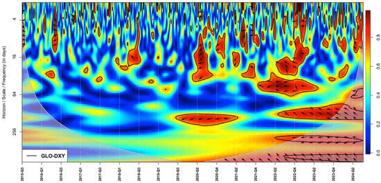 The weighted average phase weights obtained from the wavelet coherence analyses provide quantitative measures of how strongly each asset pair exhibits the conventional “strong-dollar, weak-asset” behavior. In the WTC results (Table 5), for instance, traditional assets such as gold (GLD-DXY and GLO-DXY) consistently show higher weighted phase values—ranging from approximately 0.257 at sigma = 0.2 to 0.527 at sigma = 0.5 for GLD-DXY—indicating a pronounced inverse (out-of-phase) relationship with the DXY. In contrast, BTC-DXY exhibits lower weighted phase averages (from 0.147 to 0.309), suggesting that BTC’s phase behavior is less strongly tied to dollar movements. Similarly, the BTC–EURO/USD pair shows weighted averages comparable to BTC-DXY, reinforcing that BTC’s coherence is relatively muted compared to that of conventional assets.