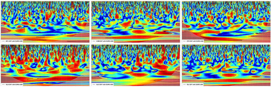 Grid of PWC heatmaps. Each panel illustrates the time–frequency relationship between two primary variables after “partialling out” the influence of a third variable (EUR/USD). Warmer colors indicate higher partial coherence, while cooler colors denote lower partial coherence. The curved shaded region near the bottom represents the cone of influence (COI), where edge effects reduce reliability.