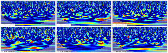 An MWC heatmap for six distinct pairs (or triplets) of time series. The horizontal axis in each panel represents time, and the vertical axis represents the scale (or approximate frequency). Warm (red) areas indicate high coherence, suggesting stronger co-movement or shared cyclical behavior in that frequency band and time interval. Cooler (blue) areas indicate lower coherence, signifying weaker co-movement. The thick black contours outline regions of statistical significance at the 5% level, and the lighter curved cone delineates the cone of influence, where edge effects may distort the results.