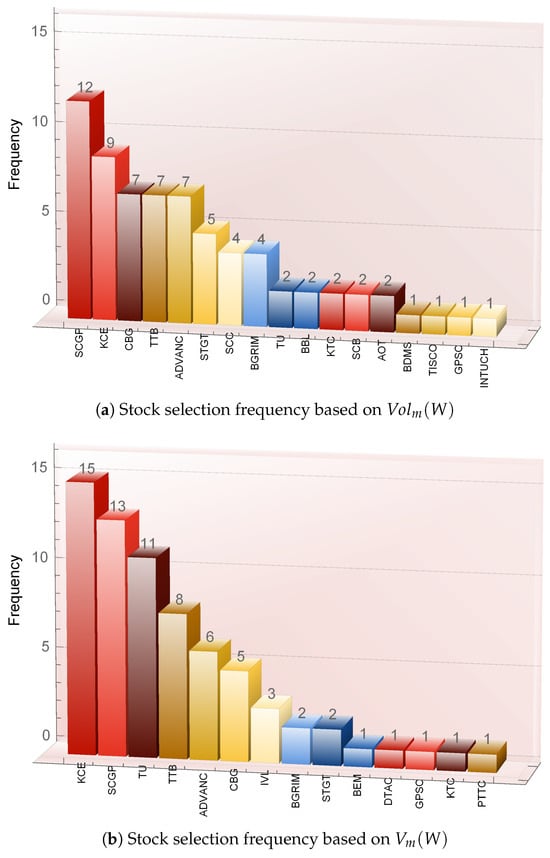 To further examine convergence across the two frameworks, we compiled the ten most frequently selected stocks under each. For realized volatility, the top selections include SCGP, KCE, CBG, TTB, ADVANC, STGT, SCC, and BGRIM, along with TU, BBL, KTC, SCB, and AOT rounding out the list. Under the variance-based framework, frequent selections include KCE, SCGP, TU, TTB, ADVANC, CBG, IVL, BGRIM, and STGT. Eight of the top ten stocks overlap across both lists, indicating an 80% concordance rate.