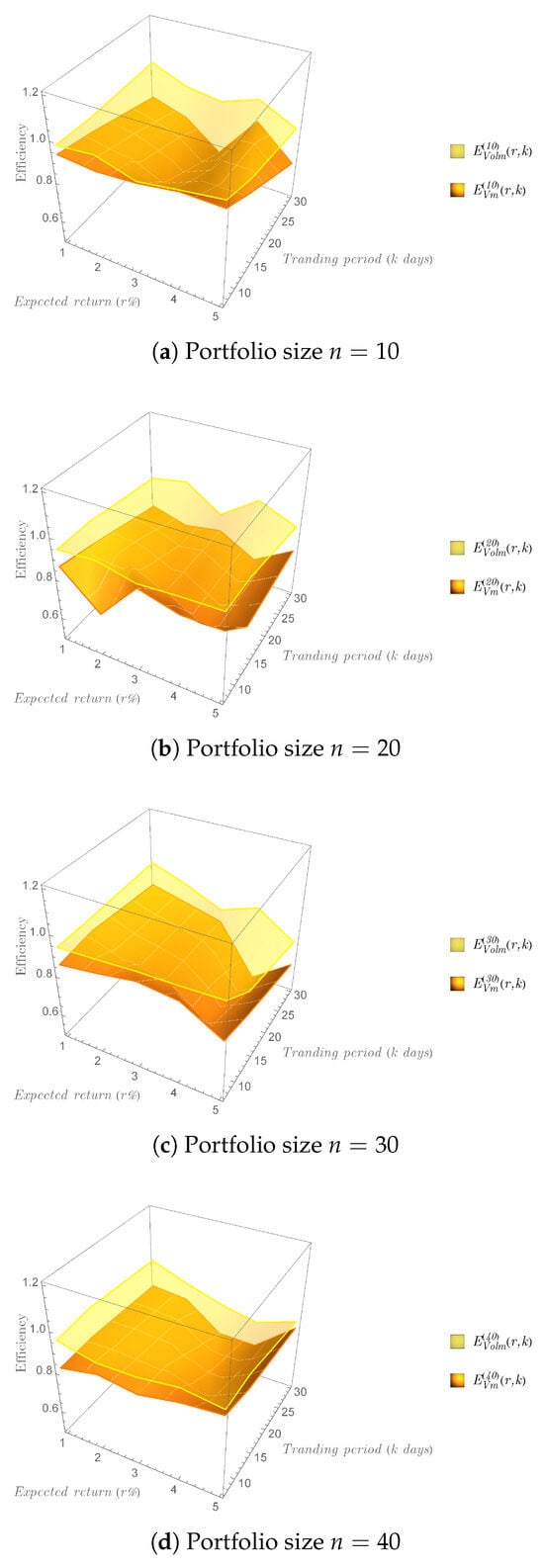 Efficiency surfaces of and for various portfolio sizes n and expected returns r, incorporating additional trading periods days. Figures (a–d) compare the efficiency of the variance-based quantifier and the realized volatility-based quantifier , showing that, while both quantifiers are efficient, consistently exhibits higher efficiency across all evaluated scenarios.