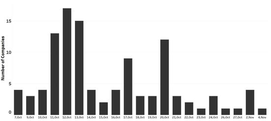 The bar chart in Figure 1 illustrates the distribution of public statements released by the selected 110 U.S. public companies over specific dates in October and November. Each bar represents the number of companies that made a public statement on a given date. The vertical axis denotes the number of companies, while the horizontal axis shows the dates on which the statements were released. An interesting insight is a noticeable peak around the 13th of October, where the highest number of companies (17) released statements, followed by 12th and 11th of the same month. This pattern suggests most companies have reacted within a week of the incident. In our analysis, we adapted the variable to represent the “days since conflict,” quantifying it as the number of days that elapsed from the onset of the conflict to when the announcement was made.
