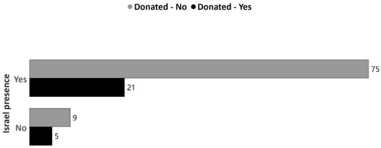 Clustered bar chart showing the relationship between U.S. companies’ operational presence in Israel and their philanthropic donations following the onset of the Israel–Palestine conflict.