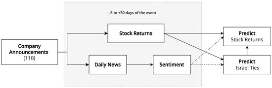 The announcements made by the companies were further classified based on the type of statement issued. We have delineated four categories for this variable: ‘Aid’, which denotes announcements of financial donations; ‘Support’, which refers to forms of assistance other than financial; ‘Business Update’, which encompasses neutral statements regarding the impact of the conflict on the company’s operations, including those found in quarterly filings; and ‘Call for Action’, used for statements where companies advocate for serious efforts to condemn and respond to the conflict, either by government officials or by urging organizations and universities to take a stand. Within the scope of our study, which examines 110 companies, the distribution of the types of statements made in response to the conflict is as follows: ‘Support’ accounts for 54 observations, ‘Aid’ comprises 33, ‘Business Update’ includes 17, and ‘Call for Action’ is the category for 6 instances. The methodology is as shown in the figure below.