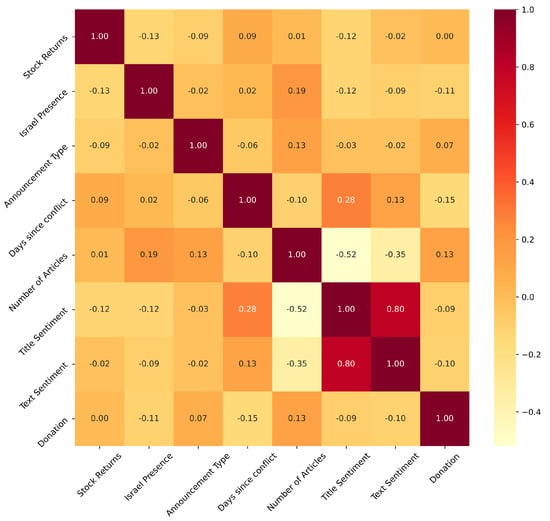 Correlation heatmap showing relationships among key features such as donation activity, article sentiment, number of articles, and their association with two outcomes—Israel presence and stock returns. No strong linear correlations are observed, suggesting the need for non-linear models.