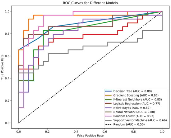Following Gradient Boosting, the neural network, with an AUC of 0.85, shows a good discrimination ability, suggesting that it can effectively capture the underlying patterns in the data through its complex architecture. The Decision Tree and Support Vector Machine (SVM) models, both with an AUC of 0.84, also demonstrate solid performance. The Decision Tree’s ‘stepped’ ROC curve reflects its binary decision-making process, which can result in sudden changes in TPR and FPR at certain thresholds. In contrast, the smooth ROC curve of the SVM indicates its consistent performance across different thresholds, likely due to its ability to find the optimal hyperplane that separates the classes.