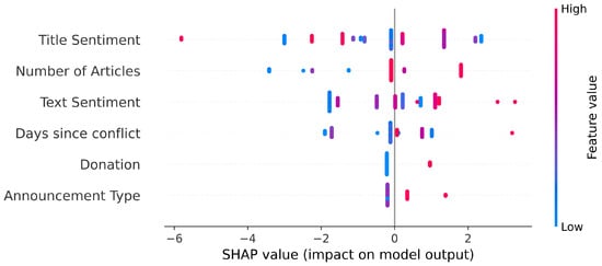 SHAP summary plot for the Random Forest Regression model forecasting daily stock returns. Sentiment variables and media volume exhibit the most influence, while the effect of announcement type and donation varies.