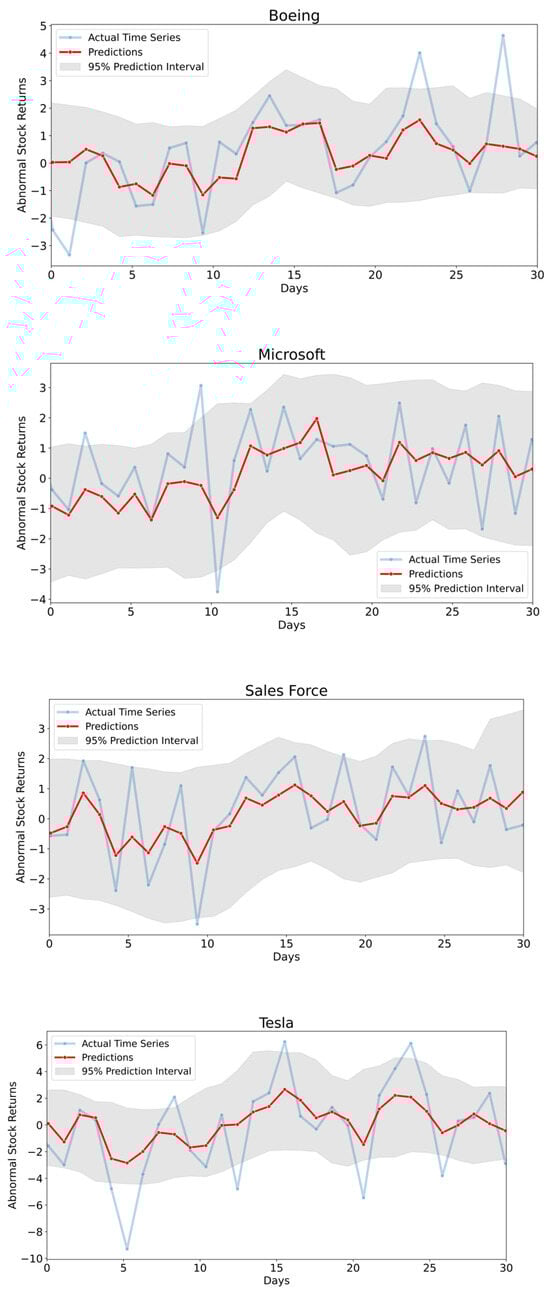 The process of rigorously testing our Random Forest model involved the careful exclusion of a subset of data from four distinct companies, ensuring that the model’s proficiency in predicting market behavior was thoroughly assessed in diverse market scenarios and business environments. The resulting time series plots (Figure 7) showcase the model’s performance in forecasting daily abnormal returns for these corporations, an endeavor crucial for gauging stock behavior and potential investment risks.