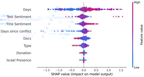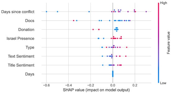 The SHAP values shown in Figure 6 serve as an interpretive tool to gauge feature importance within the predictive model for Israeli affiliations. A negative skew for ‘Title Sentiment’ suggests an inverse relationship; more optimistic Title Sentiments tend to decrease the model’s likelihood of associating a company with Israel. Conversely, the ‘Number of Articles’ displays a broad influence on the predictive outcomes, where an increased article count appears to elevate the probability of a company’s linkage to Israel, as per the model’s assessment. Further, ‘Text Sentiment’ mirrors the trend of ‘Title Sentiment’, where more positive sentiments within the body text of articles tend to reduce the model’s prediction of a firm’s presence in Israel. ‘Days since conflict’ has a cluster of values around the center, indicating that the time elapsed since the start of the conflict has a less pronounced effect on the model’s output.