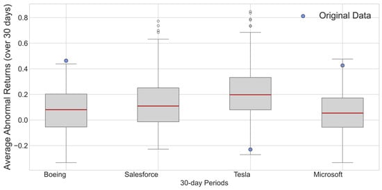 We then proceeded to gather the daily stock returns of our target companies. To assess the impact surrounding their announcement dates, we opted for a time frame that extends from five days before to thirty days after these events, encapsulated by the (−5, +30) window. This methodology allows us to closely examine the influence of announcements on the financial performance of companies. Our approach draws inspiration from previous research, which analyzed the impact of the Russia-Ukraine conflict on the European stock markets (). This precedent reinforces the validity of our time window selection for evaluating the announcements’ effects on stock returns.