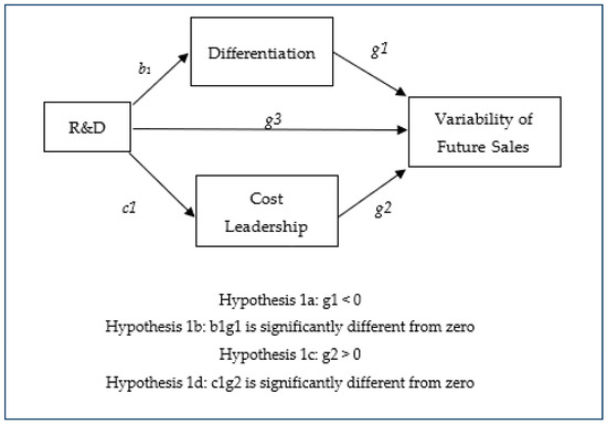 We posit that a differentiation strategy mitigates uncertainty in future sales and that the positive impact of R&D spending on sales variability is likely mediated by a differentiation strategy, which works by aligning R&D investments with the overall business strategy. In other words, when R&D efforts are closely integrated with the company’s broader strategic goals, the resulting innovations and unique products can drive sales variability in a more favorable way. The hypotheses are summarized below.