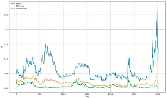 Time series plots of the implied default probability for Egypt, Morocco, and Saudi Arabia. Note: the x-axis represents the days from 15 February 2009 to 6 September 2022; for example, 500 corresponds to 14 January 2013, and 1000 corresponds to 15 December 2014.
