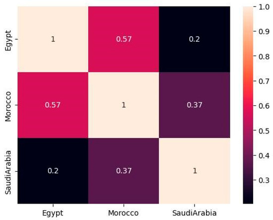 Heatmap of correlations between implied default probabilities of Egypt, Morocco, and Saudi Arabia over the period from 15 February 2011 to 6 September 2022.