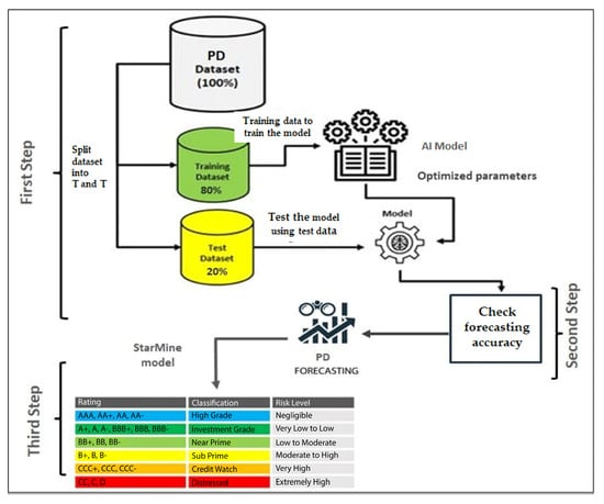 By integrating these approaches, this study aims to enhance the credit risk prediction for the selected countries. So, in the second step, we compare and check the forecasting accuracy of the implemented models. Finally, the forecasted implied default probability is used in the third step to determine the forecasted credit rating based on the classification established by the Thomson Reuters StarMine Sovereign Risk model. The complete adopted methodology is summarized in Figure 3.