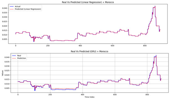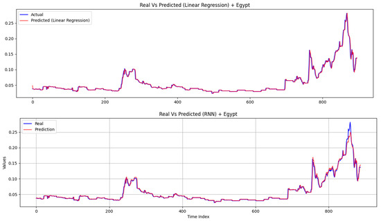 Based on this exhaustive experimental study between machine and deep learning algorithms—as evidenced by the results presented in Table 4, Table 5 and Table 6, which highlight the performance of the used models—we notice that Linear Regression ranks at the top of the list of all tested techniques on the provided dataset issued from our study. Concerning the deep learning architectures, Recurrent Neural Networks (RNNs) and Gated Recurrent Networks (GRUs) are competitive, respectively, for Egypt, Morocco, and Saudi Arabia. These architectures have proven their robustness to capture temporal dependencies between default probabilities during the period from February 2011 to September 2022. Despite the non-linear representation of LSTM and BiLSTM architectures, they fail in predicting the default probability, which can be explained by the small dataset which contains around 3k observations split into 70% for training and 30% for testing. In fact, the CDS-based implied default probability computing transforms the problem from non-linear to linear space. A complex machine learning algorithm is not required to predict future default probabilities.