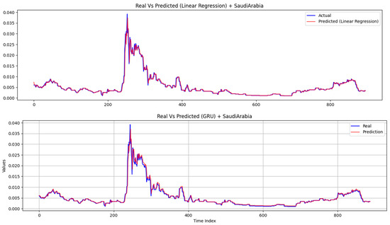 The test performance of Linear Regression and GRU models for Saudi Arabia’s implied default probability forecasting.