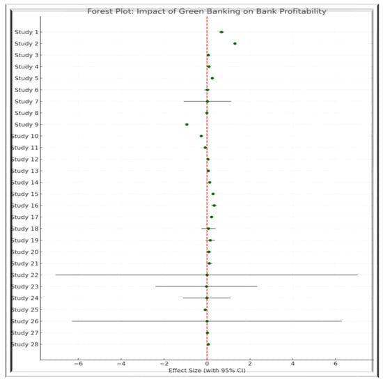 Forest plot showing the impact of green banking on bank profitability across 28 proxy relationships. Each horizontal line represents the 95% confidence interval (CI) for an individual study’s effect size, with the green dots indicating the point estimates. The red dashed vertical line represents the overall mean effect size derived from the random-effects meta-analysis. The plot illustrates the variability in the effect sizes, with several studies crossing the zero line, suggesting statistically insignificant effects in some cases. Source: Authors’ work.