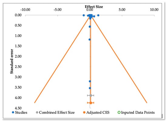 Presents a visual inspection of the funnel plot, which indicates a relatively symmetric distribution of the effect sizes around the combined effect size, with no substantial asymmetry observed. The two vertical orange lines which forms the funnel shape define a 95% confidence interval region where studies should fall if there is no publication error and the only variation is caused by sampling error. In this case, the funnel is symmetry and suggests low publication bias. Further, the absence of statistically imputed data points (green circle) suggests minimal risk of publication bias. Source: Authors’ work.