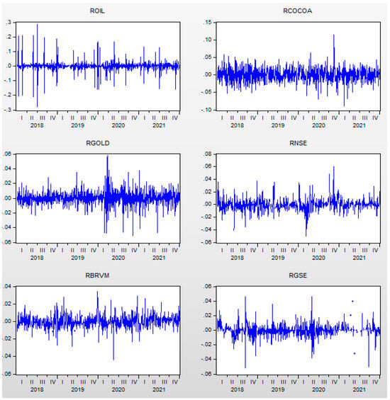 Additionally, the global commodity market for cocoa has the greatest mean returns. Furthermore, all return series seem to be negatively skewed, with the exception of the Côte d’Ivoire and Nigerian equity markets, which show positive skewness. In contrast to a normal distribution, the return is strongly leptokurtic with fat tails, as indicated by the large value of kurtosis, which ranges from the lowest, at 5.04, for the cocoa return to the greatest, at 25.66, for the oil return. Significant asymmetry and excess kurtosis are seen in these early descriptive statistics. The Jarque–Bera test statistics, which reject the null hypothesis of normality for all of the market returns under investigation at a 1% significance level, further support the non-normality.