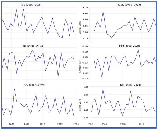 To investigate the determinants of banking performance in Tunisia, the current study utilizes a set of six basic variables, selected for their empirical relevance and role in the literature on financial innovation and banking performance. The dependent variable is return on equity (ROE), a widely utilized bank profitability indicator. Independent variables employed are bank size (SIZE), a financial innovation indicator (RF), market concentration (IHH), diversification (DIV), and inflation (INFL) as a macroeconomic control. All of these variables were drawn from previous studies such as (), () and (), and may be utilized for carrying out a comprehensive evaluation of how internal bank characteristics, as well as external economic factors, influence performance outcomes (; ; ).