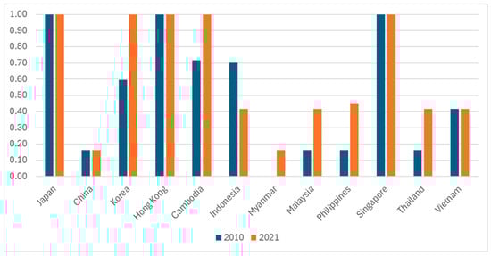 Capital account openness has also evolved significantly. Figure 1 presents the Chinn–Ito Index, a standard measure of capital account openness, for ASEAN+4 economies. Between 2010 and 2021, most countries moved toward greater liberalization. By 2021, Japan, Korea, Hong Kong, Cambodia, and Singapore showed the highest levels of capital openness. Indonesia, Myanmar, and Malaysia showed fluctuations, while China and Vietnam maintained more restrictive stances. These shifts reflect post-Asian financial crisis lessons, economic integration goals, and growing exposure to global capital markets.