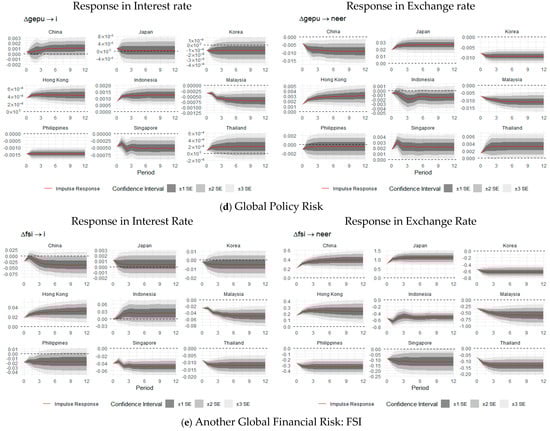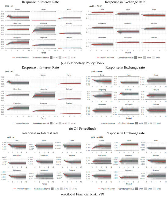 Accumulated impulse responses to shocks in global risk factors. Note: panels in this figure present the accumulated impulse response functions (IRFs) of ASEAN+4 interest rates and exchange rates to one-percentage shocks in multiple global risk factors. Shaded areas represent 68% (±1 standard error), 95% (±2 standard errors), and 99% (±3 standard errors) confidence intervals, computed using analytical standard errors derived from the estimated variance-covariance matrix.