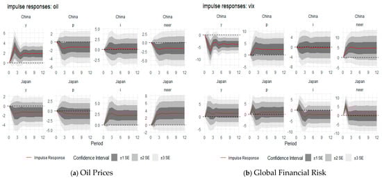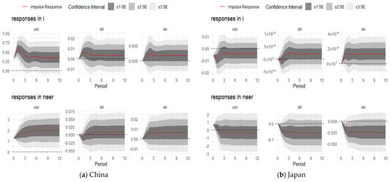 Table A1 summarizes the diagnostic test results. All SVARX models across different specifications and economies pass the stability condition, as all characteristic roots lie inside the unit circle. Regarding residual serial correlation, most models show no significant autocorrelation at the 5% level based on the LM test, with only Japan’s base model marginally significant (p = 0.050). These results confirm that the models are adequately specified and suitable for structural impulse response analysis.