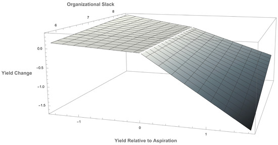 Three-dimensional plot depicting interaction between organizational slack and yield relative to aspiration. Note: The interaction effect for underperformance (yield relative to aspiration < 0) is not statistically significant.