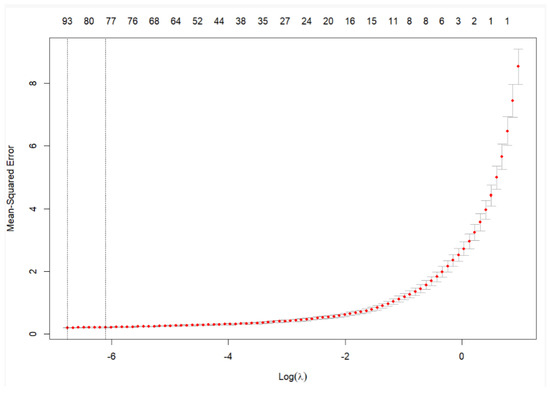 Cross-validated mean squared error as a function of the log-transformed regularization parameter (log ) in a LASSO regression model. As log () increases, the LASSO penalty strengthens, progressively shrinking less informative coefficients toward zero. This regularization process enables automatic feature selection by removing irrelevant variables, thereby enhancing model interpretability and reducing the risk of overfitting. The selected value of minimizes prediction error while retaining only the most predictive features for the 12-month forecast. Without this step, the model is more likely to capture spurious correlations, diminishing both reliability and insight into the true drivers of forecast performance.