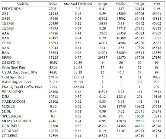 EIKON is a well-regarded database that is used extensively in academia. It includes global economic, company, and financial data. Data retrieved from this database includes some US commodities like gold, platinum, oil, gas, and corn, as well as shipping rates and Baker Hughes. We retrieved monthly data for the period January 1960 until December 2023 from the Refinitiv EIKON database. In total we included and combined 27 financial variables from EIKON and FRED-MD to create a new dataset with financial data. Some descriptive statistics are presented in Figure 2 below. Using a wide range of financial variables allows us to capture these diverse sources of inflationary pressure. No single variable can reflect the full complexity of global inflation dynamics. Data alignment of EIKON data with FRED-MD is no issue, as the data frequency used is the same. Further details on the data are included in the Appendix A.