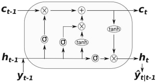 The LSTM model is characterized by two key components: the cell state, which acts as the long-term memory, and the hidden state, representing the short-term memory. A schematic representation of an LSTM cell is provided in Figure 5. Initially, both states are assigned default values (often zeros), and they are subsequently updated as new input sequences are processed. The model uses sigmoid and tanh activation functions within its gating mechanisms—namely the input, forget, and output gates—to regulate the flow of information. These functions determine how much of the new input is retained, how much of the previous state is forgotten, and how the internal memory is updated, thereby enabling the LSTM to capture complex temporal dependencies over time.