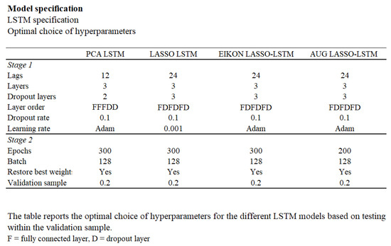 The LASSO-LSTM models differ from LSTM in the process of feature selection. Specifically, we examine how LASSO-LSTM performs compared to LSTM, applying the standard PCA feature selection approach.