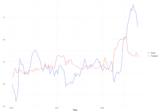 This figure illustrates a 6-month forecast using the LASSO-LSTM model, showing actual (blue line) and predicted (red line) CPIAUSCL values. The model closely follows the actual values in periods of low volatility but struggles to capture sharp increases, particularly toward the end of the forecast period. This indicates the model’s limitations in predicting sudden changes in the data.