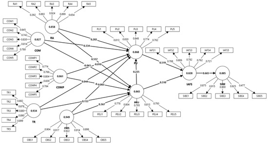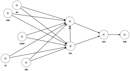 Conceptual model, where: RA: relative advantage, COM: compatibility, COMP: complexity, TR: trialability, OBS: observability; PEU: perceived ease of use; PU: perceived usefulness; IAFS: intention to adopt fintech services; SIBE: sustainable investment decisions in the blue economy. Source: authors’ work.