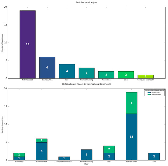 The high rate of non-disclosure, where 48.6% of appointed female directors’ educational qualifications were not publicly available, raises significant concerns about corporate transparency in the Saudi market. Despite our efforts to address this limitation of missing information, no additional data were provided. We were, therefore, limited to what was officially reported in annual reports, governance disclosures, and company websites. This pattern of incomplete disclosure is not merely a data limitation—it reflects a structural issue within the governance environment. From an investor’s perspective, limited transparency at the board level introduces uncertainty and may increase perceived risk. It also hinders the market’s ability to evaluate the qualifications and strategic potential of new board members.