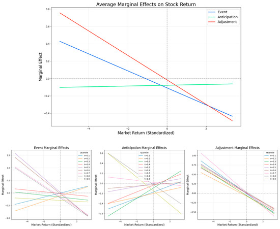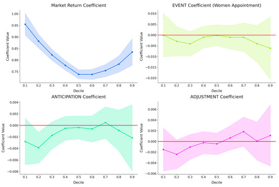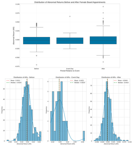 In fact, two days demonstrate particularly negative average abnormal returns (ARs) in the “Before” period: days −9 (−0.42%) and −7 (−0.50%). These anticipated negative reactions could indicate information leaks or market expectations. Moreover, day −7 exhibits a significant negative average AR of −0.50% (p = 0.034), while day −6 shows a notable positive average AR (+0.47%, p < 0.05), which may reflect a market correction following the negative reactions of prior days. This observation is intriguing because these two significant days fall within the “Before” period, suggesting that the market begins to respond to female appointments even prior to the official announcement. This may indicate information leaks or anticipations based on rumors or early signals. While not a formal test of market efficiency, this pattern is consistent with the partial characteristics of semi-strong form efficiency, where prices reflect available public or semi-public information.