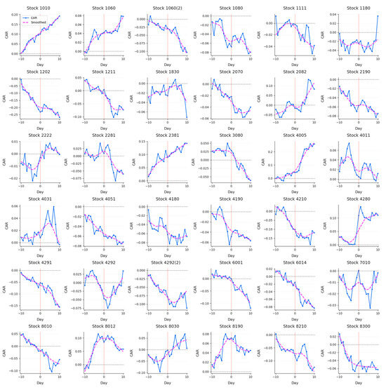 The parameters and are estimated using an estimation window of 92 trading days, ending 11 days before the event date (−102, −11) to avoid contamination from potential information leakage. This 92-day estimation window choice balances the need for a stable beta estimation with the constraints of our sample. Specifically, in two firms, the number of trading days between their IPO and the appointment date was only 125 and 145 days, respectively. A longer estimation window (e.g., 120–250 days) would have excluded these firms and reduced the sample size, thereby weakening the power of our analysis.