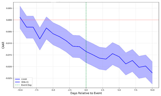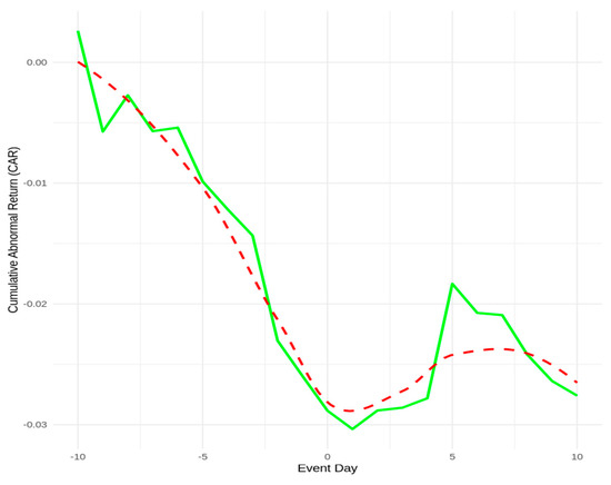 The analysis of average abnormal returns (AR) for each day of the event window in Figure 4 reveals an interesting trend. On the event day (day 0), the average abnormal return is −0.21%, indicating a slightly negative immediate market reaction to female appointment announcements. This negative reaction continues in the days following the announcement, with negative average abnormal returns for most days of the post-event window.
