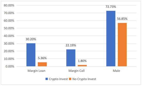 Table 2 presents the descriptive statistics for those who said “Yes—C(1)” and “No—C(0)” to owning or holding cryptocurrency investments. Table 2 and Figure 1 show that among the respondents who said “yes” to owning cryptocurrencies, 30% used a margin loan; among those who said “no”, only 5% used a margin loan.