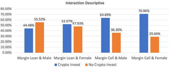 Table 5 and Figure 2 present detailed descriptive statistics for the interaction terms. Interestingly, when we interacted the variables “male” with “margin loan” and “margin call,” the results reversed, showing a negative association with cryptocurrency investment. Table 6 shows that males with a margin loan had a 0.11 lower probability of investing in cryptocurrency than would be expected based on the separate effects of being male and having a margin loan. Similarly, Table 7 shows that males with a margin call had a 0.09 lower probability of investing in cryptocurrency than would be expected based on the separate effects of being male and having a margin loan.