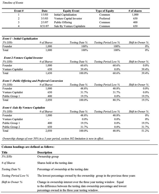 Figure 1 shows an example of a hypothetical IPO firm. First, the firm sells 39.4 percent of its shares to a venture capitalist two months after formation and then another 19.5 percent in an IPO four years later. Even though there has been an increase of over 50% by one or more 5% shareholders (the VC and IPO shareholders go from 0 to a total of 51.2%), this does not trigger the ownership change since the VC investment occurred prior to the start of the three-year testing window. However, once the venture capitalist liquidates his or her shares on the open market six months later, the shift in ownership exceeds 50 percent for the testing period, as the total increase in ownership of the public shareholder groups has gone from 0 to 51.2% in a three-year period.5 The deductibility of the firm’s NOLs, accumulated immediately prior to the change, is now subject to the Section 382 limitation.
