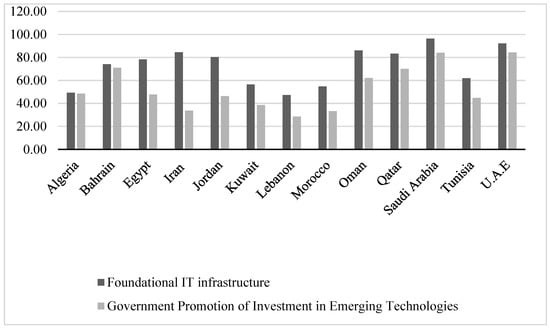 Figure 1 shows remarkable differences in the digital capacity of MENA countries. On one side, Saudi Arabia leads the region in deploying advanced IT infrastructure, followed by United Arab Emirates (UAE) and Oman. In terms of government promotion of investment in emerging technologies, the UAE, Saudi Arabia, and Qatar stand out with the highest scores. Remarkably, the Gulf countries significantly outperform the rest of the MENA region in terms of their digital capabilities. In contrast, Lebanon, Morocco, and Kuwait trail behind, with markedly lower scores, which signals the low adoption of IT infrastructure development and technology investment.