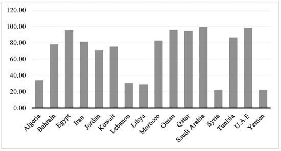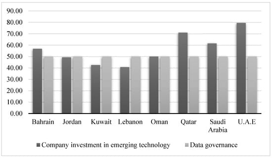 In terms of the innovation capacity of MENA countries, displayed in Figure 2, the highest scores for company investment (>60) are shown in the UAE, Qatar, and Saudi Arabia, whereas Lebanon, Jordan, and Kuwait exhibit the lowest scores (<50). Additionally, the MENA countries all show the same level of data governance, exhibiting a score of 50, which indicates that they need more stringent policies to strengthen data monitoring and supervision.