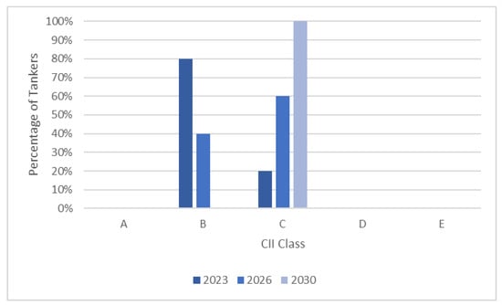 Figure 1. Tankers’ CII class for the years 2023, 2026, and 2030.