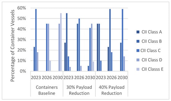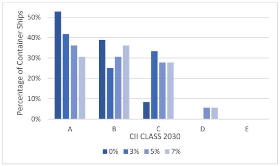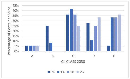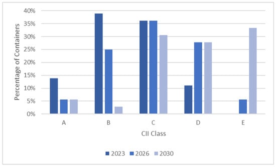 Figure 3. Container ships’ CII class for the years 2023, 2026, and 2030.