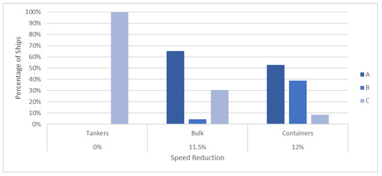 An analysis of the speed reduction required for the examined ship types to achieve at least a CII Class C rating by 2030 is presented in Figure 4.